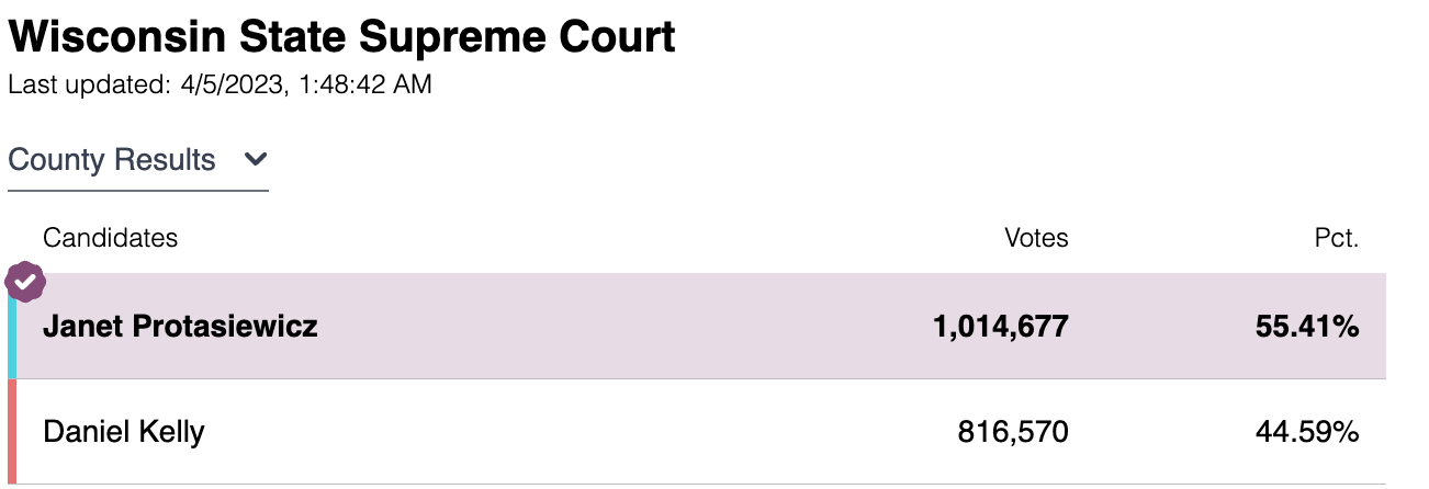 1. Wisconsin voters on Tuesday gave control of the state’s highest court to liberals for the first time in 15 years, instantly reshaping politics in the Badger State by putting the state laws most celebrated by conservatives at risk of being overturned — including a 19th Century-era ban on abortions. Milwaukee County Judge Janet Protasiewicz defeated former Supreme Court Justice Dan Kelly in a race that served as a referendum on the U.S. Supreme Court’s decision to overturn Roe v. Wade, shattering national spending records and attracting a level of political warfare unseen before in a state judicial race. The map below tells the story. (Source: jsonoline.com)