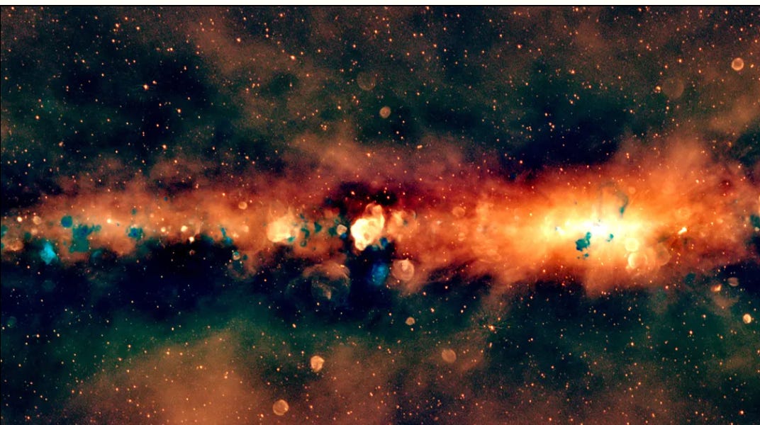 16. Astronomers from the International Centre of Radio Astronomy Research (ICRAR) have released an incredible image of the Milky Way shining in low-frequency radio light, revealing a spectacular realm invisible to the human eye — and indeed most telescopes. Made by meticulously stitching together thousands of observations over eighteen months, the epic mosaic shows a galaxy awash with the circular blotches of supernova remnants, the leftovers of a catastrophic explosion that destroys a star. (Sources: vimeo.com, icrar.org)