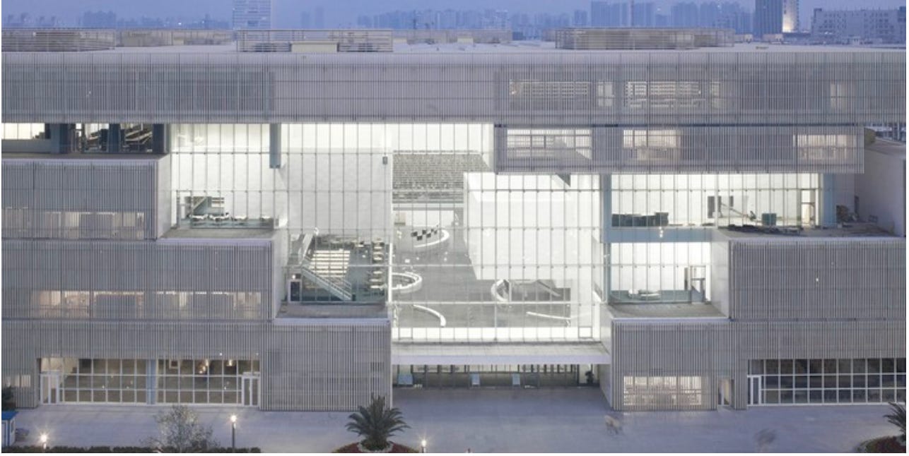(Riken Yamamoto: Tianjin Library, 2012, Tianjin, China. The building appears as 10 crisscrossing levels; from any level viewers can see other levels. Photo via archdaily.com)