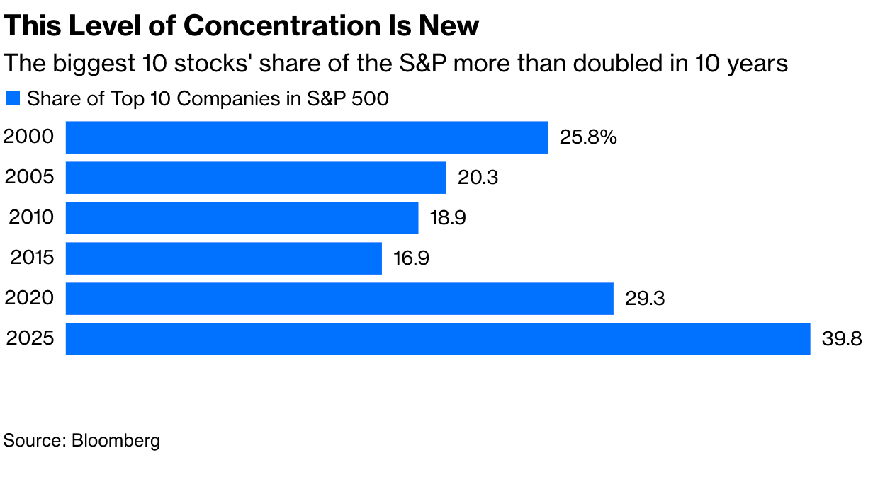 But the dominance of the very biggest stocks is new, and hints at at least one critical difference from the dot-com era. This is how the biggest 10 stocks’ weighting in the S&P 500 has changed at five-yearly intervals going back to 2000. It’s usual for a few winners to win big at any one time. That’s the nature of capitalism. It’s unheard of for 2% of the index’s companies to account for virtually 40% of its value: