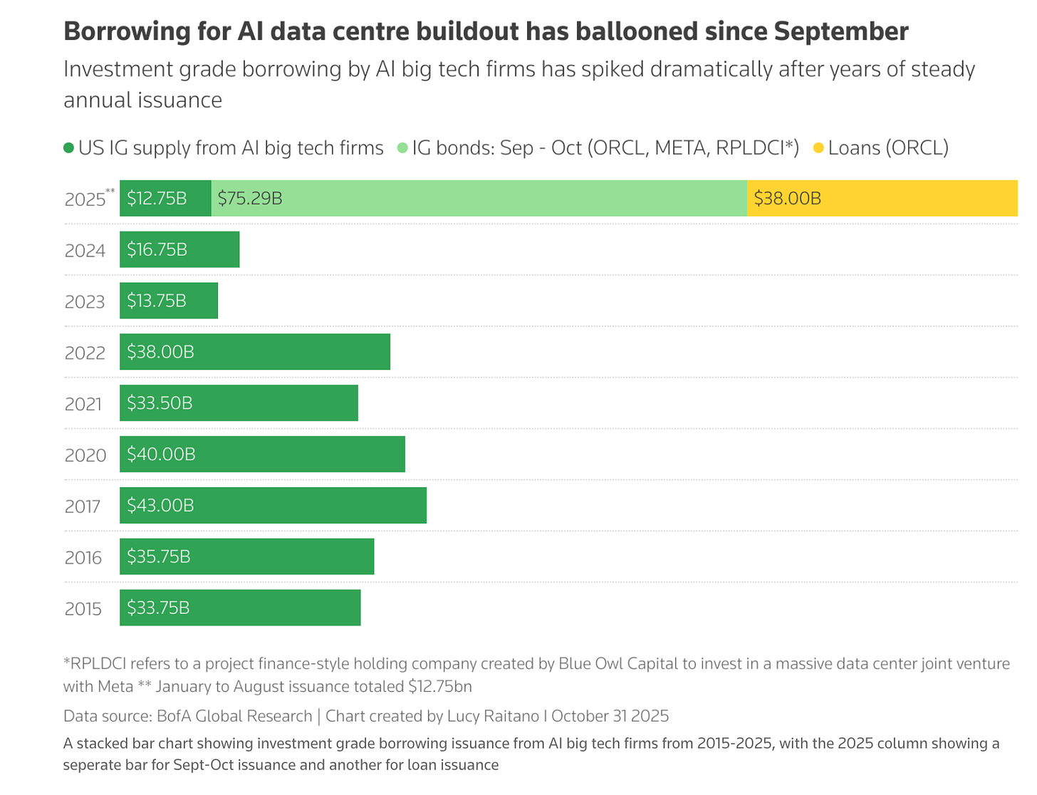 In 2025, borrowing by AI big tech firms for data center buildout is set to soar to over $126 billion—more than triple any previous year—driven by a dramatic spike in bond and loan issuance since September. (Source: paulkedrosky.com)