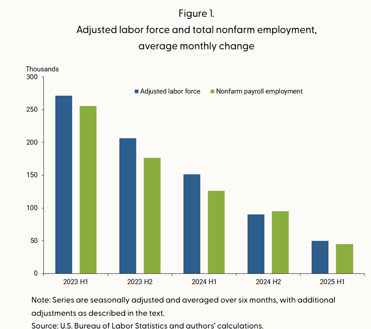 The average monthly growth in both the adjusted labor force and nonfarm payroll employment declines sharply from early 2023 to mid-2025, dropping by about 80%, with both indicators nearly converging at their lowest point in 2025 H1. (Source: paulkedrosky.com)