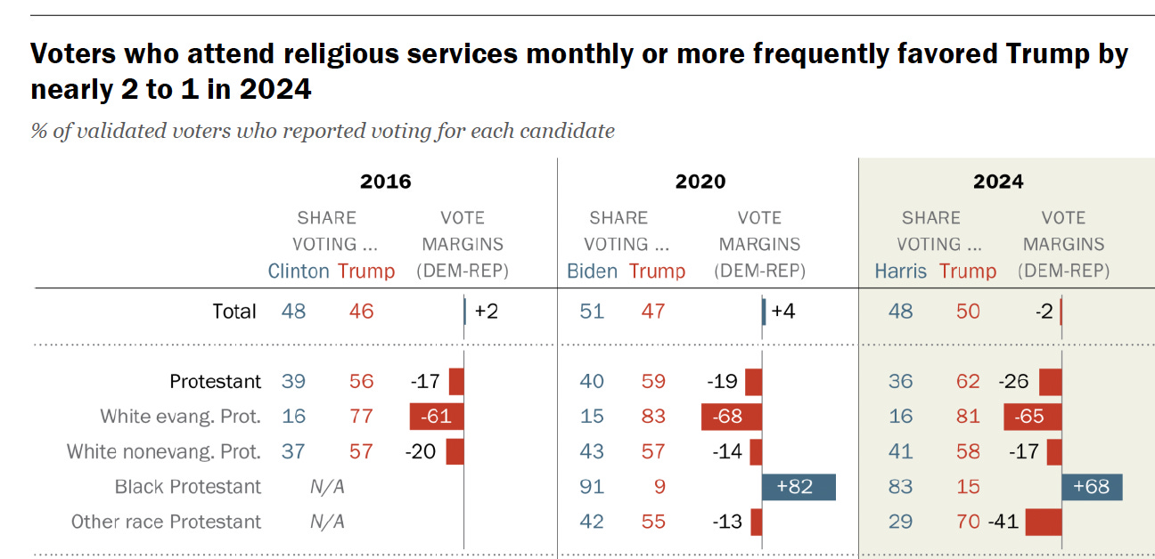There is one constituency that President Trump dares not cross: white evangelical Protestants. Roughly 80 percent of them voted for him in the 2016, 2020 and 2024 presidential elections. This from Pew Research’s massive post-election surveys:
