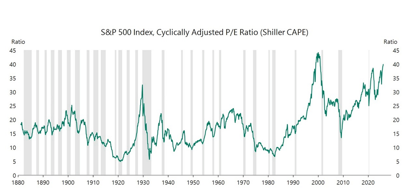 The cyclically adjusted price earnings ratio, also known as the Shiller P/E, is a stock market valuation measure that divides the current stock price by the average of the last 10 years’ inflation-adjusted earnings, thereby smoothing out business cycle volatility to assess long-term over/undervaluation and predict future returns. It provides a better gauge of sustainable earnings power than the traditional P/E ratio, which uses only one year’s earnings. The latest reading shows that equity valuations are near the highest levels since 1880. See chart below. (Sources: apolloacademy.com, linkedin.com)