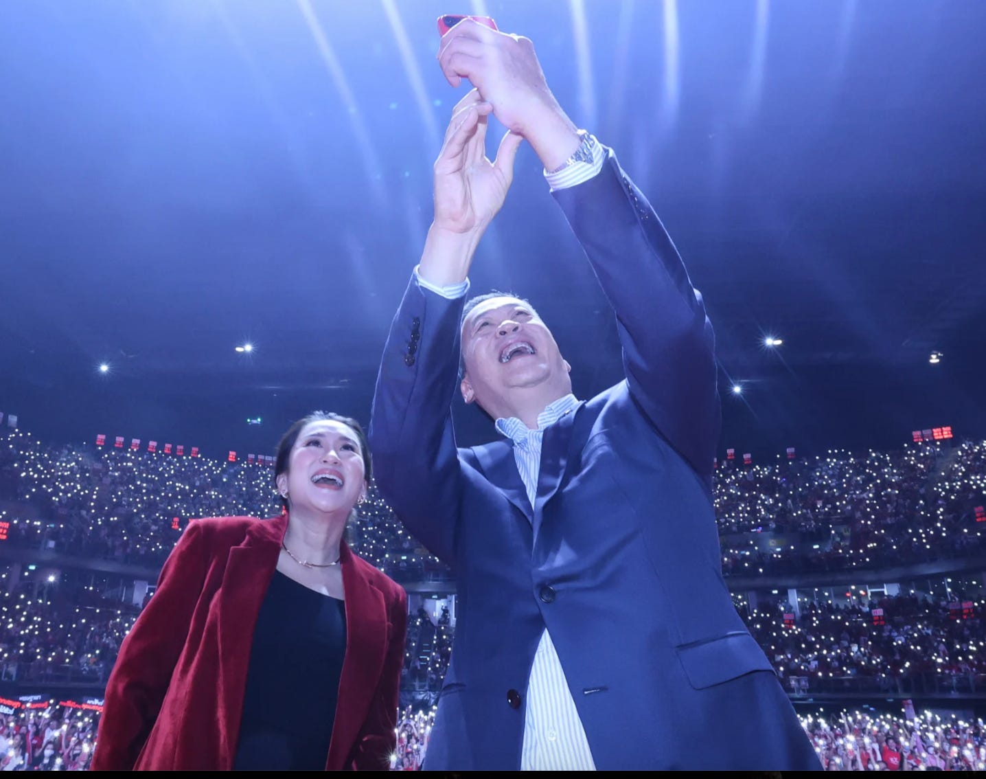 Paetongtarn Shinawatra and Srettha Thavisi of Pheu Thai party take a selfie with supporters during a rally in Bangkok on May 12. (Photo by Ken Kobayashi)