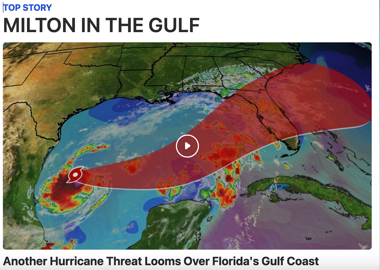 4. Tropical Storm Milton has formed in the Gulf of Mexico and now poses a major hurricane threat to Florida just over a week after Helene pushed through the region. The National Hurricane Center says that "there is an increasing risk of life-threatening storm surge and wind impacts for portions of the west coast of the Florida Peninsula beginning late Tuesday or Wednesday." Hurricane and storm surge watches will likely be required for portions of Florida on Sunday. Tropical storm watches have been issued for portions of Mexico's Yucatan Peninsula. (Source: weather.com)